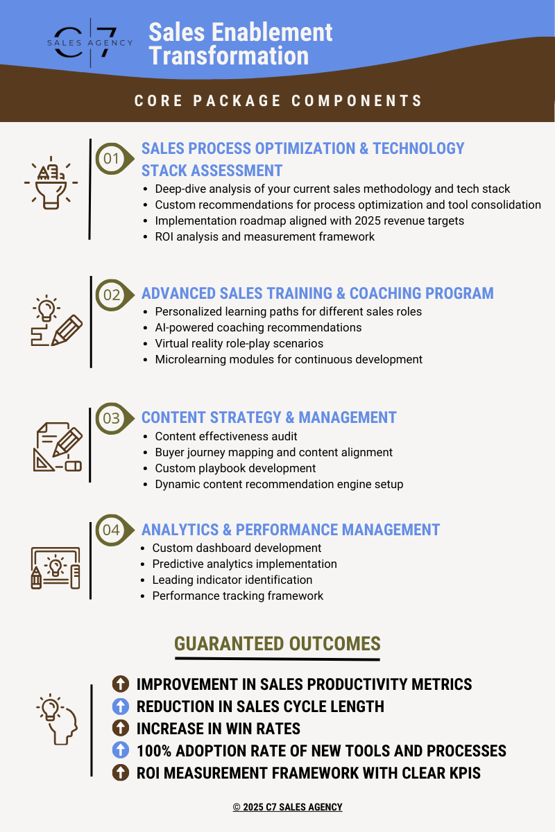 Transform your sales organization with our comprehensive sales enablement transformation package designed specifically for forward-thinking sales leaders looking to maximize their 2025 performance. This carefully crafted offering addresses the critical challenges facing sales organizations while capitalizing on emerging opportunities in the evolving sales landscape.